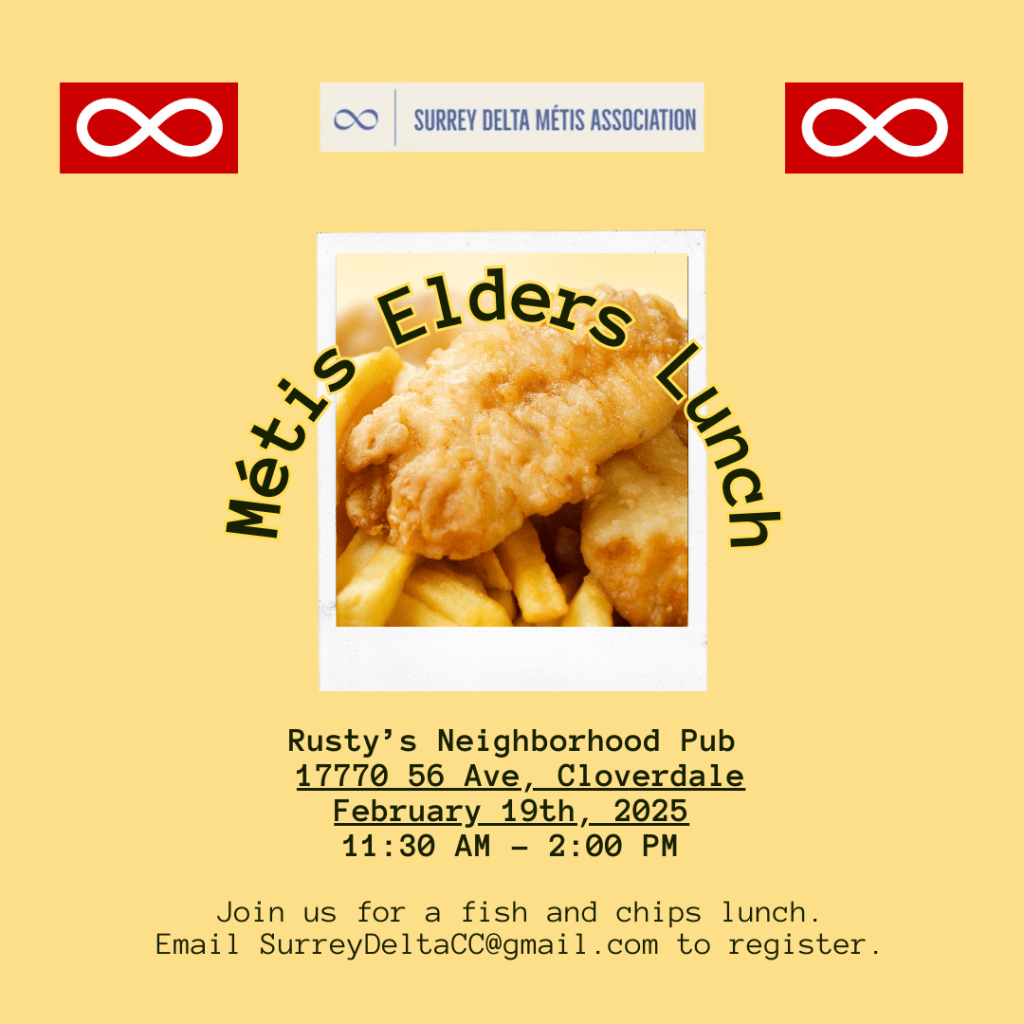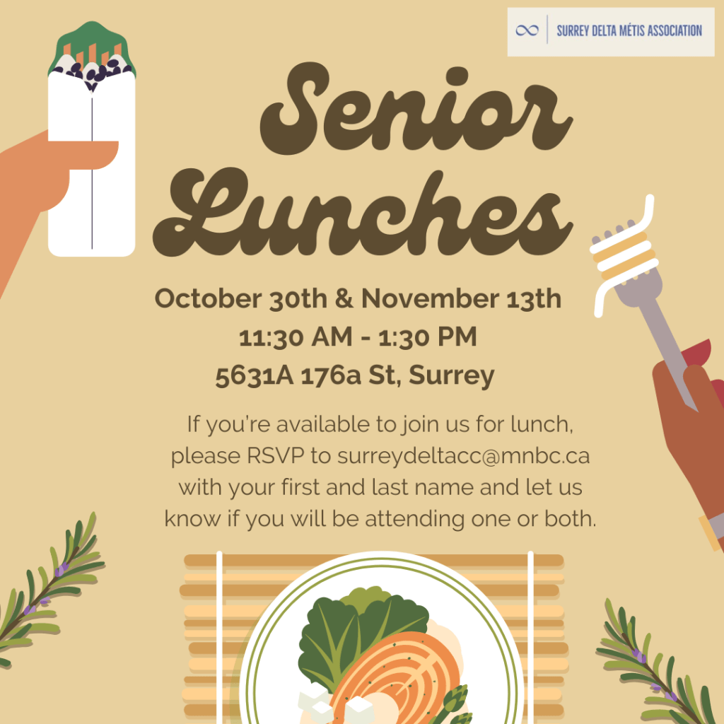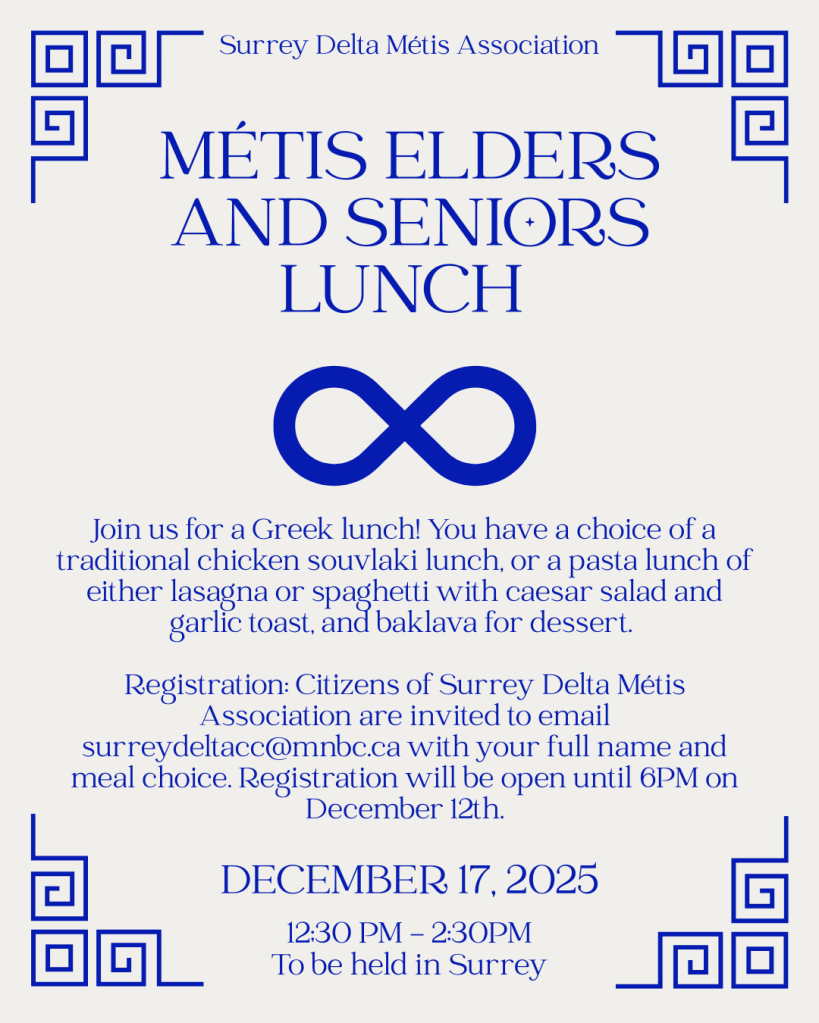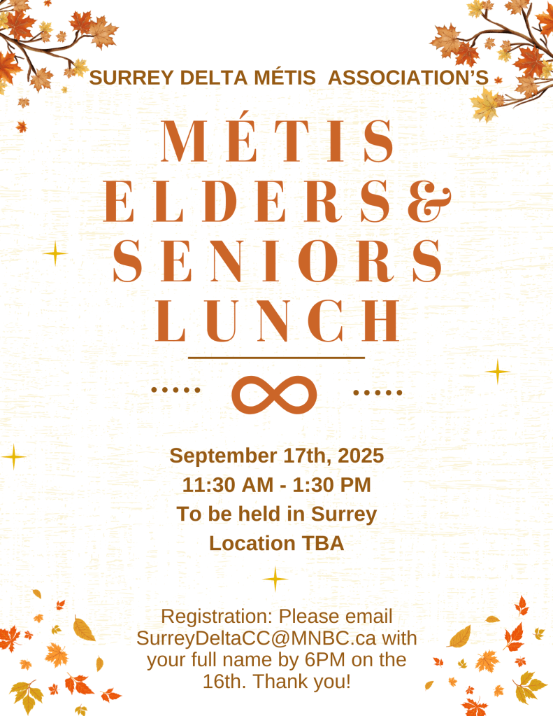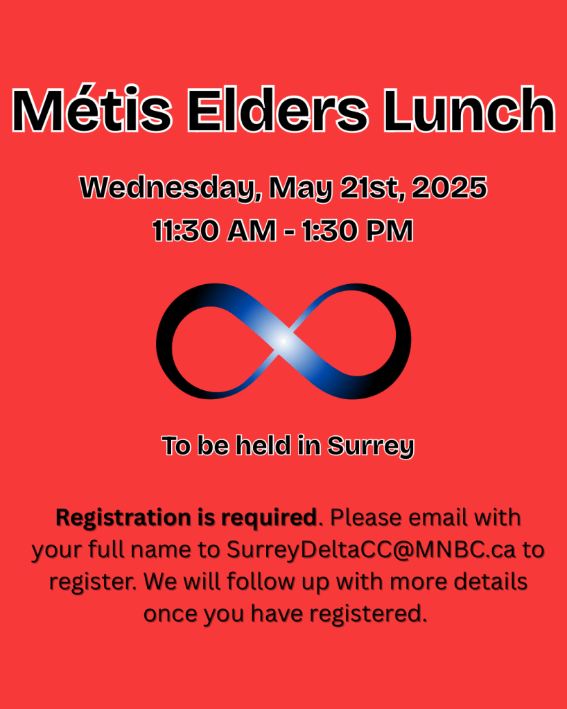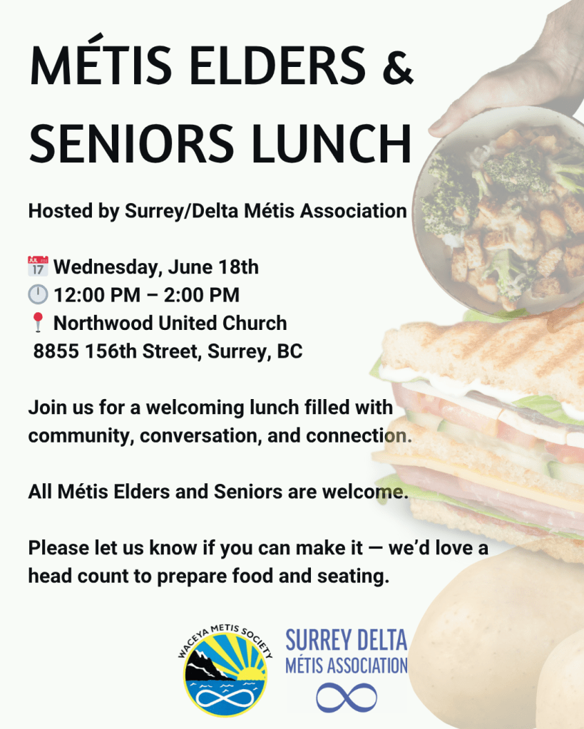 Our next lunch with Waceya Métis Society is coming up on July 16th in Langley. It’s a great opportunity to connect with fellow Métis Elders and Seniors while enjoying a meal and good company.