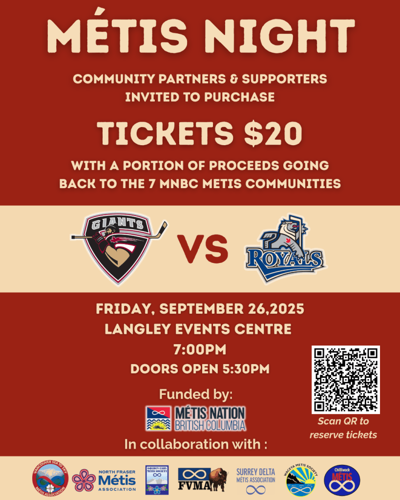 Métis Night with the Vancouver Giants! Come celebrate Métis culture and cheer on the Vancouver Giants as they face the Victoria Royals! This is a perfect night for Region 2 Métis families to connect, have fun, and enjoy some high-energy hockey together.